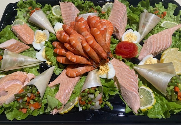 Saumon et saumon fumé avec panier macédoine, crevettes et langoustine n°14 : 18 €/p